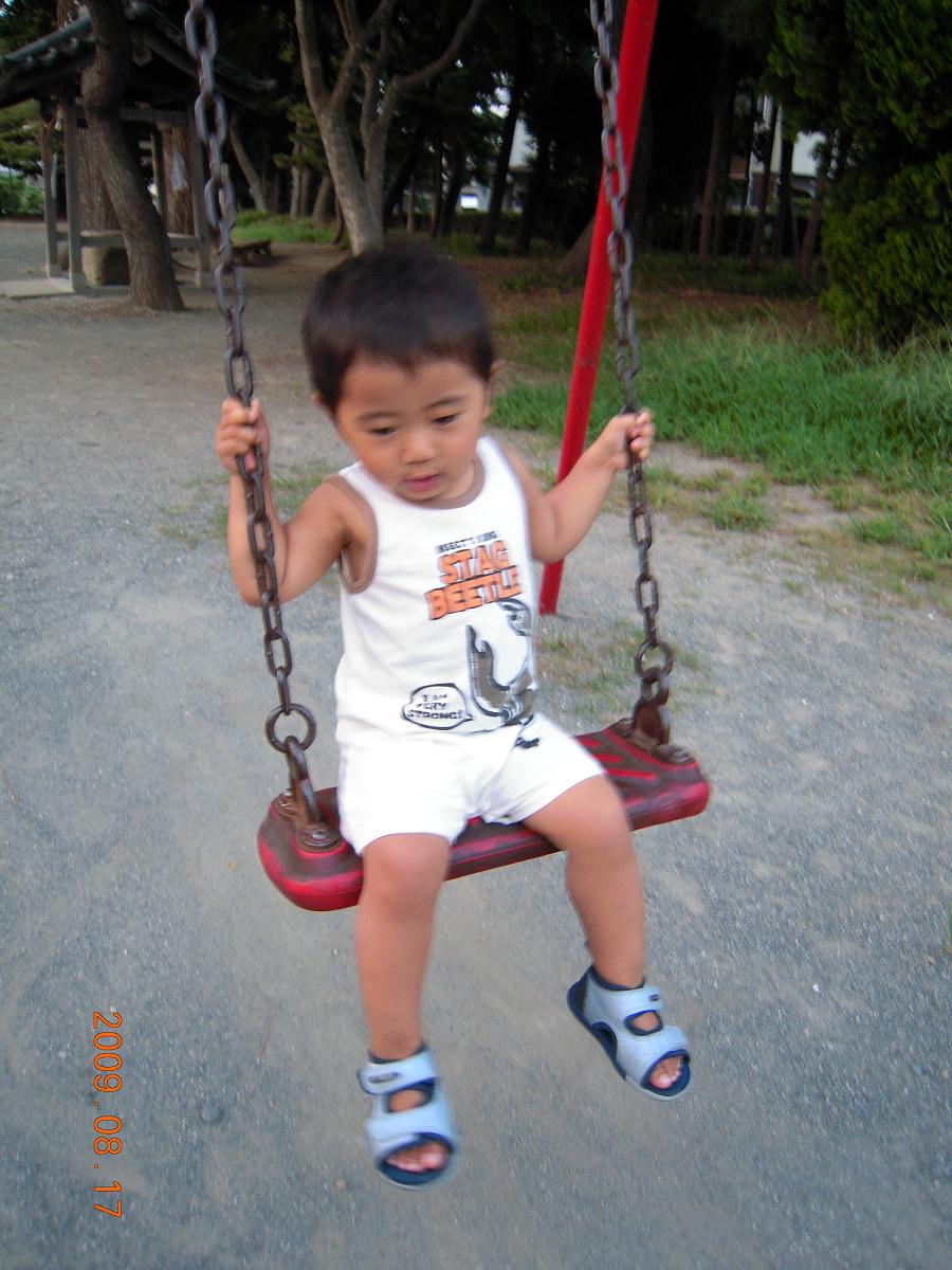 (ブレてるけど)近くのお宮さんでブランコデビューもした♪