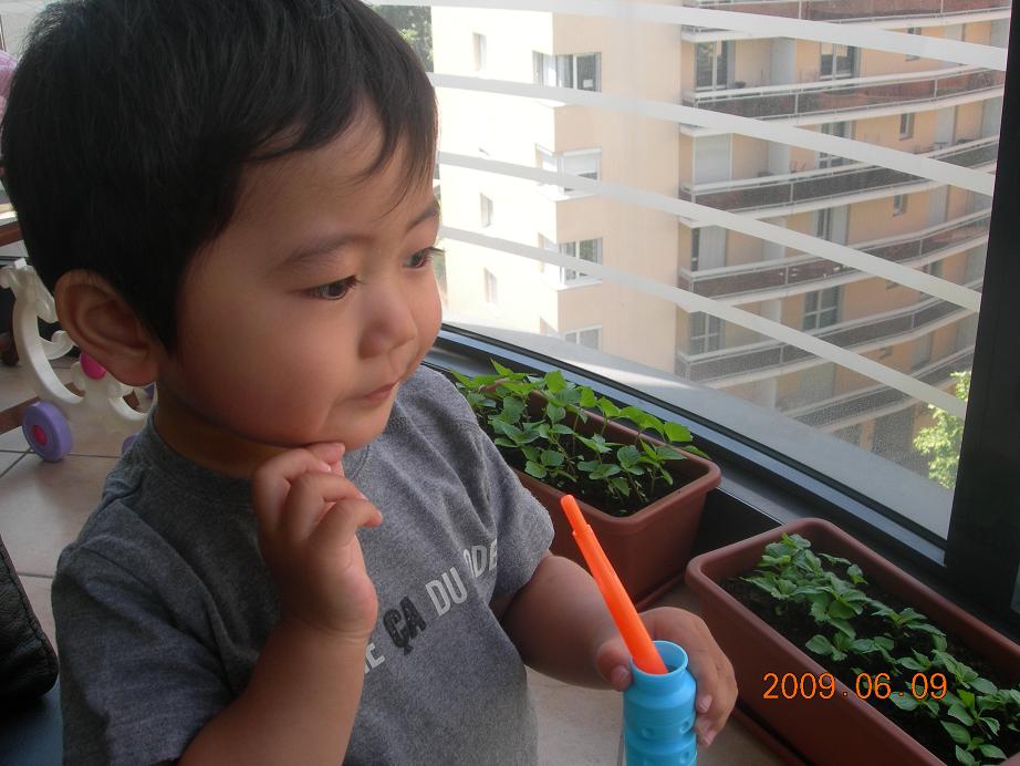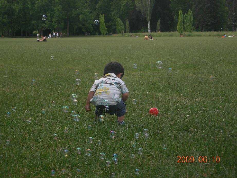 シャボン玉に夢中の息子。