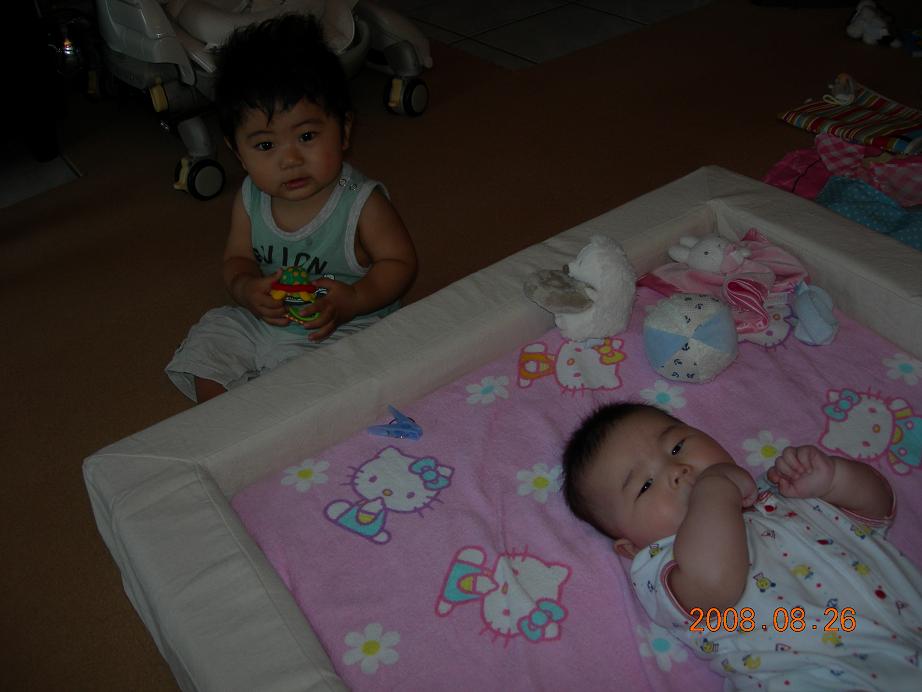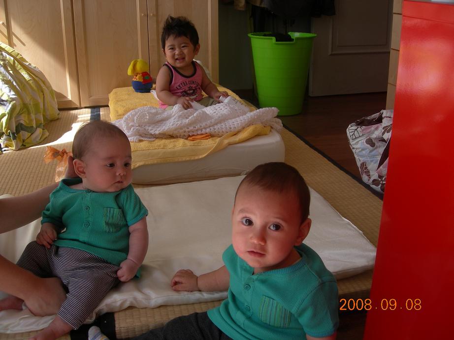 まだお座り前のRくんと、3ヶ月の松くんは