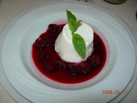 アーモンド風味の白プリン、シナモン風味のチェリー添え
